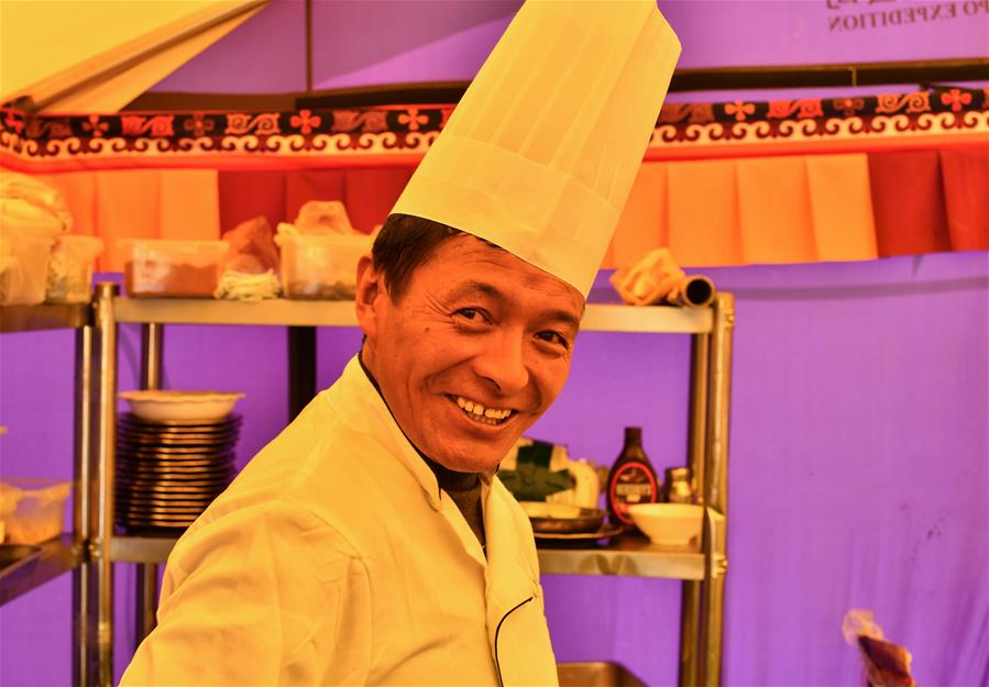 高山廚師赤列在珠峰大本營(5月8日攝)。5月8日是世界微笑日。在海拔5200米的珠峰大本營,參與2020珠峰高程測量的各方人員,微笑期待本次測量活動的圓滿成功。