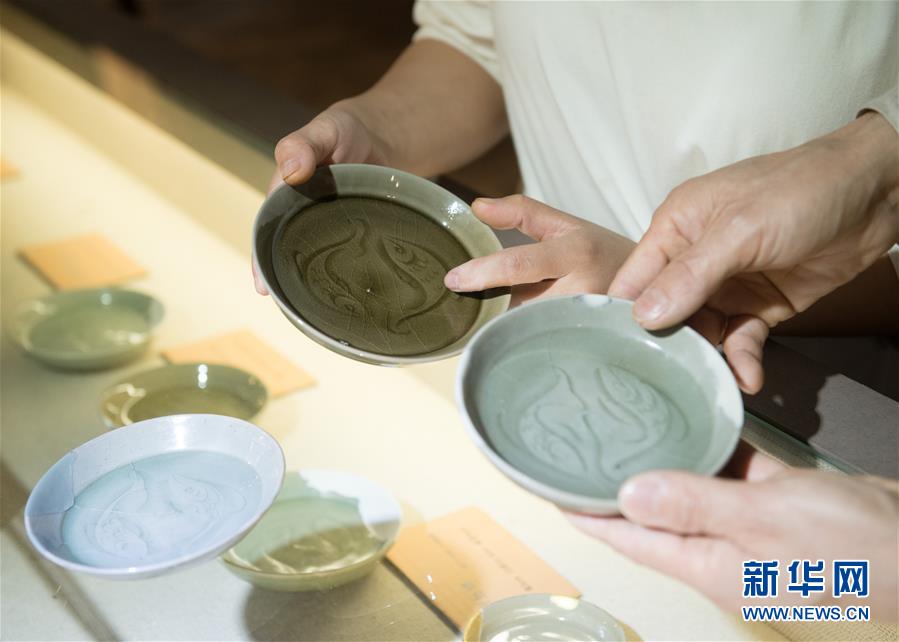 5月8日,“90后”瓷人湯佳(左)將自己制作的魚紋盤帶到龍泉青瓷裝飾紋樣研究所,跟項(xiàng)宏金收藏的古瓷器比對。1965年出生的項(xiàng)宏金,被浙江龍泉年輕一代瓷人稱為“項(xiàng)哥”,他從20世紀(jì)90年代開始收集龍泉青瓷標(biāo)本,研究青瓷紋樣。2014年出版著作《龍泉青瓷裝飾紋樣》,次年開設(shè)龍泉青瓷裝飾紋樣研究所,將自己收藏的千余件標(biāo)本跟瓷器愛好者、創(chuàng)作者免費(fèi)分享。新華社記者翁忻旸攝