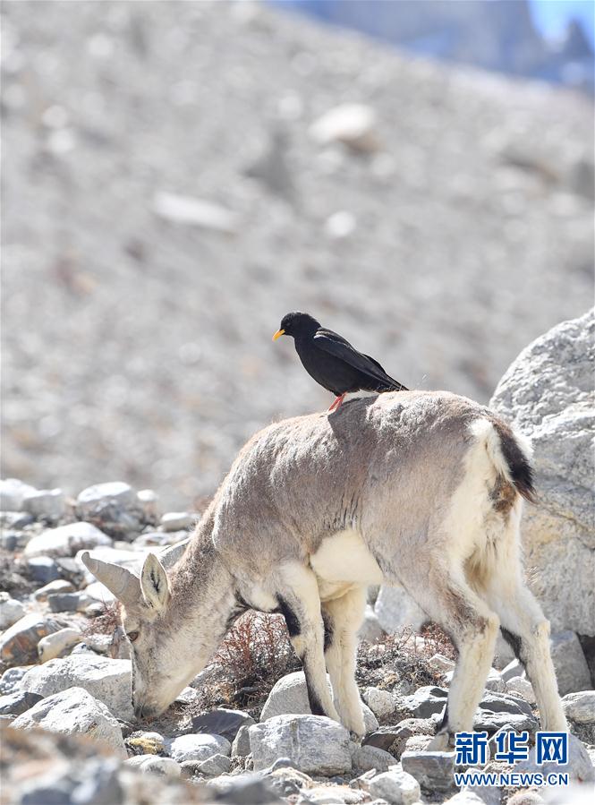 黃嘴山鴉停在巖羊背上(5月8日攝)。當(dāng)日,一群巖羊在珠峰大本營周圍覓食,黃嘴山鴉飛到巖羊身上停留,構(gòu)成一幅幅生動有趣的雪域圖畫。新華社記者普布扎西攝
