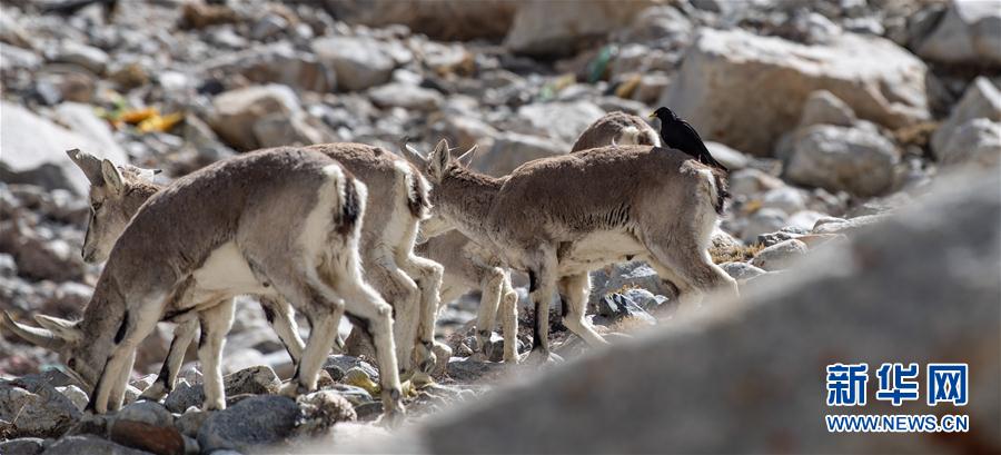 黃嘴山鴉停留在巖羊身上(5月8日攝)。當(dāng)日,一群巖羊在珠峰大本營周圍覓食,黃嘴山鴉飛到巖羊身上停留,構(gòu)成一幅幅生動有趣的雪域圖畫。新華社記者晉美多吉攝