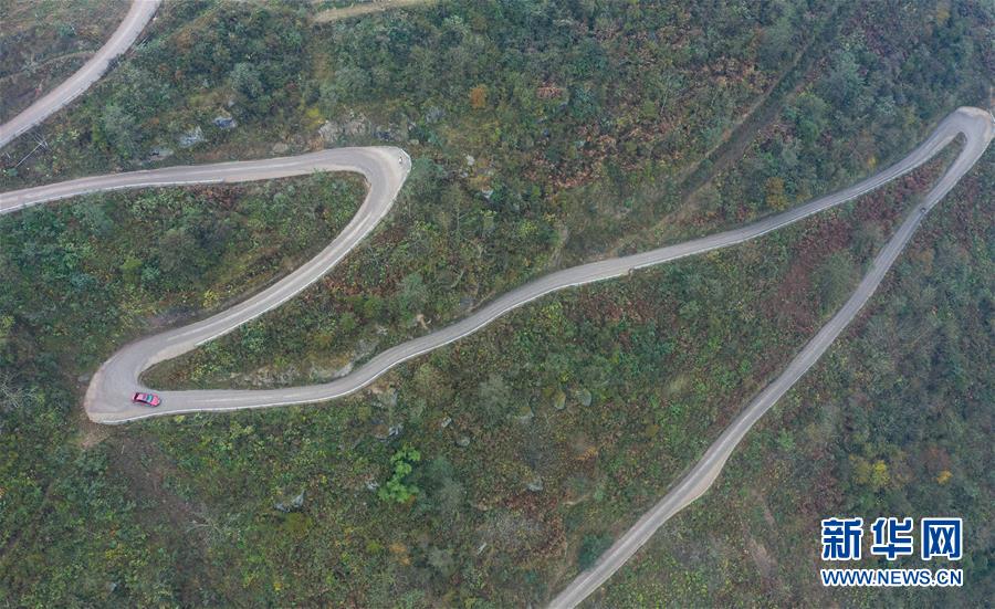 曾柱銘開著自己的小轎車行進(jìn)在雷波縣箐口鄉(xiāng)厥箕村的山道上(2019年12月12日攝,無人機照片)。新華社記者江宏景攝