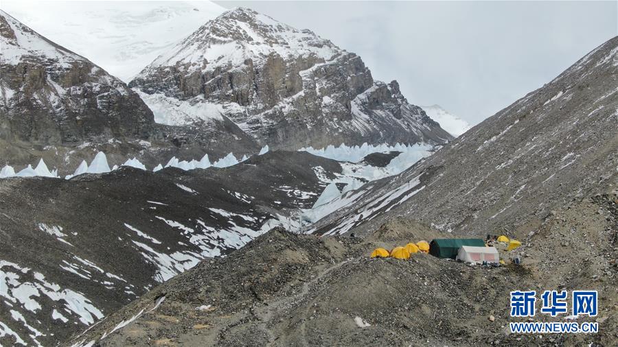 這是海拔5800米的珠峰過渡營地(5月8日攝,無人機(jī)照片)。珠峰過渡營地海拔5800米,是連接前進(jìn)營地和珠峰大本營的重要一站。登山愛好者從大本營徒步大約四個小時就能抵達(dá)過渡營地。此段路程亂石林立,同時也能欣賞壯美的冰川。新華社記者孫非攝