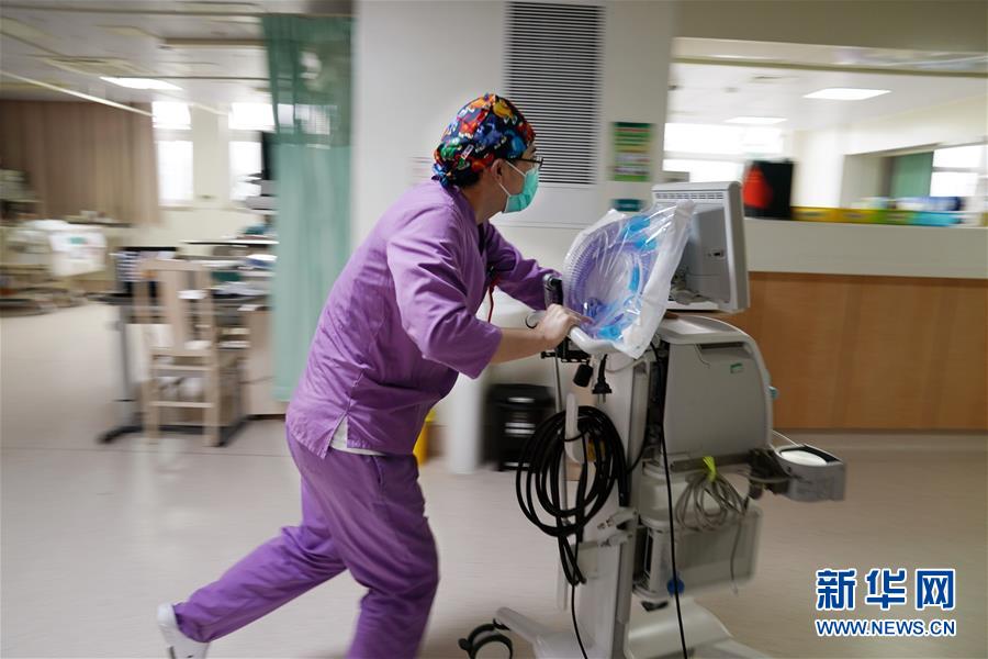 5月10日,在上海市普陀區(qū)中心醫(yī)院內(nèi)科重癥監(jiān)護(hù)室,護(hù)士來文健在推運(yùn)設(shè)備。新華社記者劉穎攝