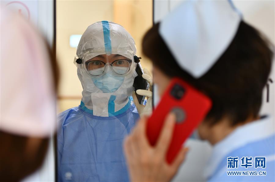 5月11日,在空港醫(yī)院的隔離病房,身處“紅區(qū)”的護士(中)和同事通話。新華社記者李然攝