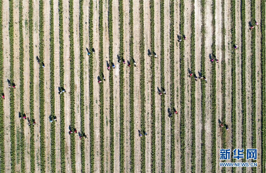 5月11日,采茶工在寧夏百瑞源賀蘭山基地采摘枸杞芽茶(無人機照片)。當日,寧夏百瑞源賀蘭山基地枸杞芽茶全面進入采摘季。據了解,該基地茶園面積300余畝,助力附近200多名農民就業(yè)增收。新華社記者楊植森攝