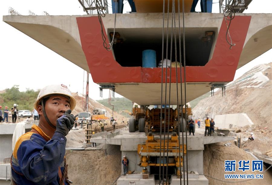 5月13日,中鐵七局的工作人員在位于河南焦作的施工現(xiàn)場指揮架梁作業(yè)。 當(dāng)日,隨著最后一榀長24米、重552噸的箱梁架設(shè)就位,太焦高鐵全線橋梁架設(shè)完成。從山西太原到河南焦作的太焦高鐵是國家規(guī)劃建設(shè)的“八縱八橫”高速鐵路網(wǎng)的重要組成部分,計(jì)劃2020年底建成通車。 新華社記者李安攝