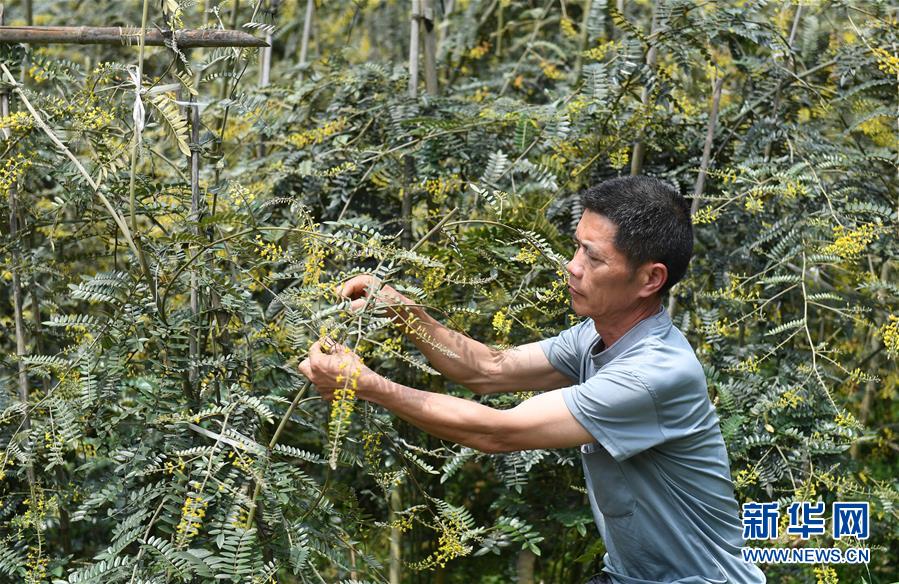 5月13日,在廣西環(huán)江毛南族自治縣下南鄉(xiāng)下塘村,村民在管護中草藥。新華社記者陸波岸攝