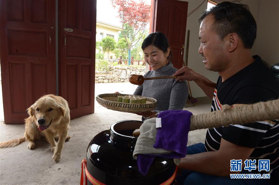 5月14日,在貴州省畢節(jié)市百里杜鵑管理區(qū)黃泥鄉(xiāng)龍?zhí)链逡患揖谱鞣?,村民?duì)玉米進(jìn)行發(fā)酵。貴州省畢節(jié)市百里杜鵑管理區(qū)黃泥鄉(xiāng)龍?zhí)链宓凝執(zhí)凉啪疲颡?dú)特的古法釀酒技術(shù),口感獨(dú)特而遠(yuǎn)近聞名。全村有釀酒戶(hù)142戶(hù),年產(chǎn)量達(dá)45萬(wàn)多公斤,龍?zhí)凉啪七h(yuǎn)銷(xiāo)重慶、廣東、浙江等地,龍?zhí)凉啪埔殉蔀辇執(zhí)寥嗽鍪盏闹匾獊?lái)源。新華社記者楊楹攝