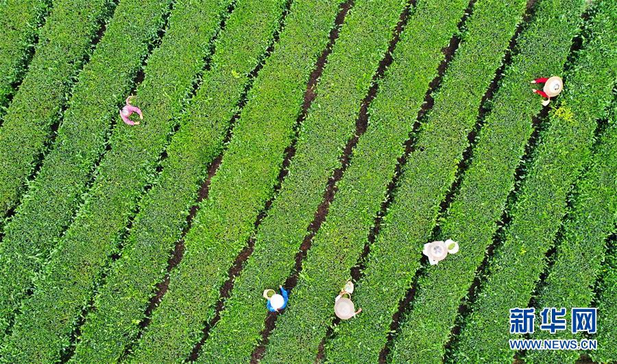 5月17日,村民在新院村茶葉基地采摘夏茶(無人機(jī)照片)。新華社記者王全超攝