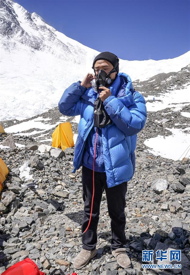 5月18日,國測一大隊沖頂隊員王偉在練習(xí)使用氧氣面罩。新華社特約記者扎西次仁攝