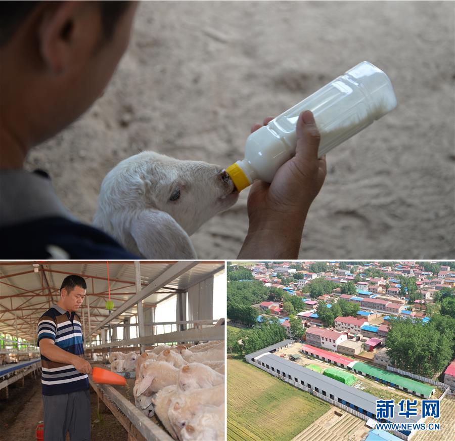 這是一張拼版照片(圖片均為5月16日攝)。上圖:在河南省開封市尉氏縣大橋鄉(xiāng)崗劉村,34歲的丁懿軍在給小羊喂奶;下左圖:丁懿軍在給羊喂食;下右圖:在扶貧政策扶持下,丁懿軍在村頭建了占地8畝的羊養(yǎng)殖場,現(xiàn)養(yǎng)羊800多只(無人機照片)。新華社記者孫清清攝