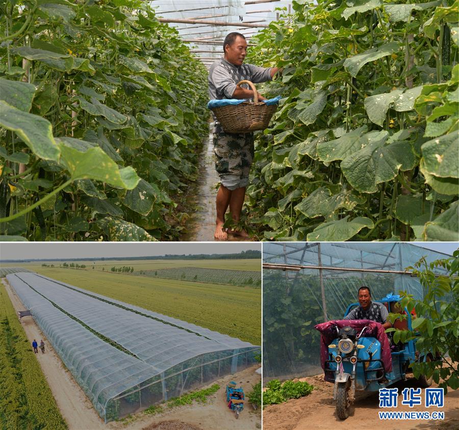 這是一張拼版照片(圖片均為5月16日攝)。上圖:在河南省開封市尉氏縣大橋鄉(xiāng)馮村,50歲的文海軍在他的黃瓜種植大棚內(nèi)采摘黃瓜;下左圖:在扶貧政策扶持下,文海軍蓋了占地6畝的蔬菜溫室大棚(無人機照片);下右圖:文海軍駕駛?cè)嗆囘\輸采摘的黃瓜。新華社記者孫清清攝