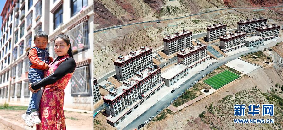 拼版照片:左圖為西藏昌都市八宿縣夏里鄉(xiāng)吉熱村村民次日措姆和兒子加擁羅布在安置點(diǎn)樓前;右圖為八宿縣乃然易地扶貧搬遷安置點(diǎn)一角(無(wú)人機(jī)照片)。2018年,次日措姆和家人搬遷到乃然易地扶貧搬遷安置點(diǎn),住進(jìn)了75平方米的新居。次日措姆還在安置點(diǎn)找到一份保潔員工作,每月有1900元的收入 (5月10日攝)。新華社記者詹彥攝