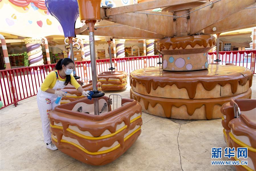 5月19日,工作人員對(duì)游樂設(shè)施進(jìn)行消毒。當(dāng)日,湖北武漢歡樂谷重新開放。園區(qū)執(zhí)行客流量管控,游客需通過網(wǎng)上預(yù)約才能進(jìn)入,室內(nèi)場(chǎng)館暫不開放。新華社記者熊琦攝