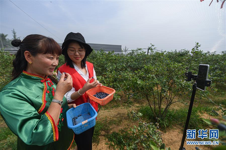 5月20日,長興縣林城鎮(zhèn)上獅村的藍莓種植幫扶基地內,青年志愿者與種植戶通過手機直播藍莓的采摘,并介紹當?shù)厮{莓生長環(huán)境和品質,進行網上銷售。新華社記者徐昱攝