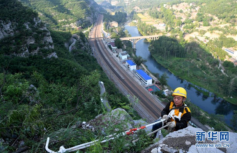 5月21日,捅山工胡軍從山頂垂降,準備開始捅山作業(yè)。新華社記者郝源攝