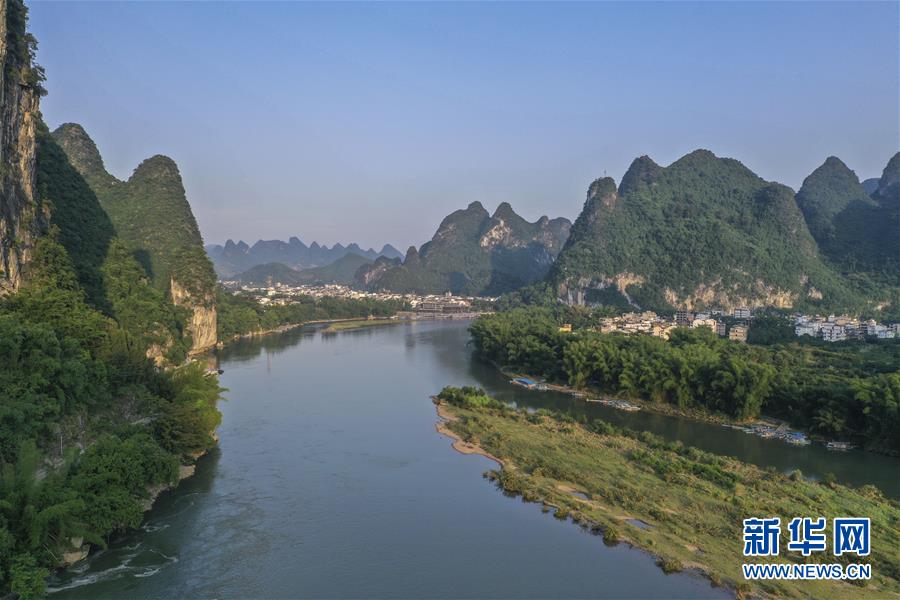 這是在廣西桂林市陽朔縣興坪鎮(zhèn)拍攝的山水風光(5月19日攝,無人機照片)?!吧n蒼森八桂,茲地在湘南。江作青羅帶,山如碧玉篸……”一千多年前,唐朝詩人韓愈寫盡桂林山水之美。初夏時節(jié),在廣西桂林市陽朔縣興坪鎮(zhèn),藍天白云下,煙雨朦朧中,桂林山水盡顯秀美。新華社記者 曹祎銘 攝