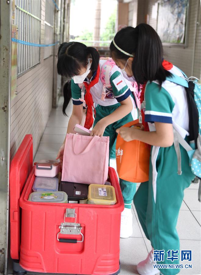 5月25日,廣州市荔灣區(qū)蔣光鼐紀(jì)念小學(xué)的學(xué)生將自帶的飯盒放在教室門(mén)口的箱子里,工作人員將為學(xué)生統(tǒng)一配餐。當(dāng)日,廣州市各小學(xué)一至三年級(jí)學(xué)生正式開(kāi)學(xué)復(fù)課。至此,廣州市中小學(xué)各年級(jí)已全部開(kāi)學(xué)復(fù)課。新華社記者盧漢欣攝