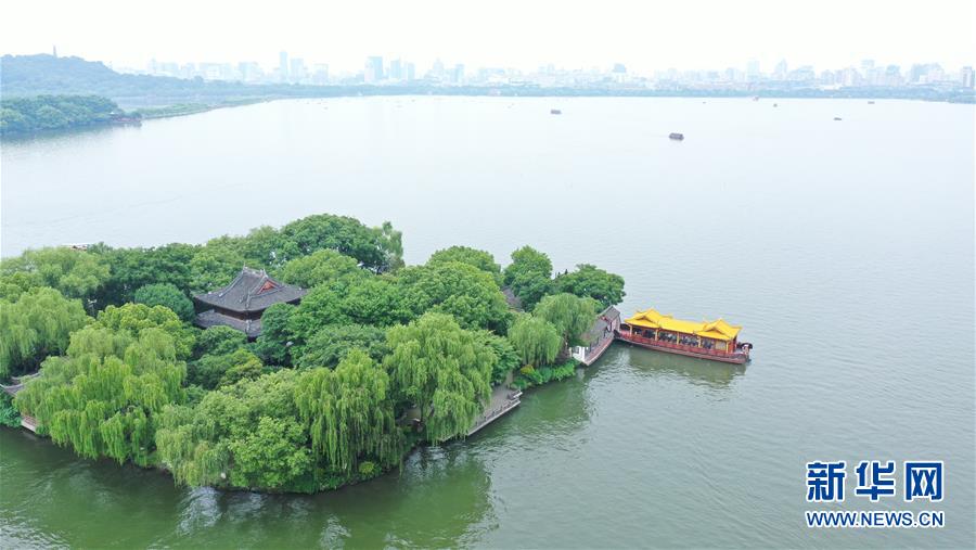 5月27日,船只在西湖湖心亭靠岸(無人機照片)。隨著氣溫升高,杭州西湖綠意蔥蘢,展現(xiàn)出柔美的湖光山色。新華社記者翁忻旸攝