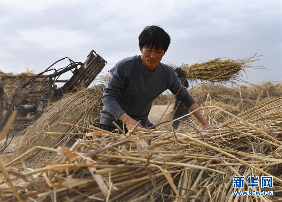 5月20日,在新疆博湖縣西南河口葦場(chǎng),工人將蘆葦打包。新華社記者宋彥樺攝
