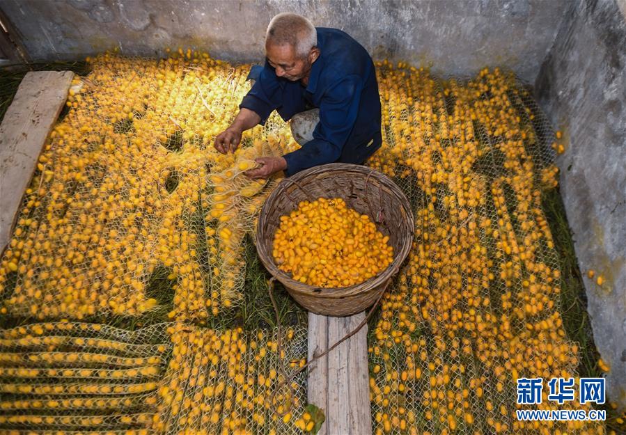 5月27日,桐鄉(xiāng)市鳳鳴街道建勝村70歲的村民宋柏明在收獲“黃金繭”。他今年在桐鄉(xiāng)興民蠶業(yè)專業(yè)合作社的指導(dǎo)下首次養(yǎng)3張黃金蠶繭種,收獲“黃金繭”近400斤,比往年同期增收1500元。近期,蠶桑之鄉(xiāng)浙江省桐鄉(xiāng)市的蠶農(nóng)們迎來了蠶繭豐收的季節(jié),其中新品種“黃金繭”的增收效果尤其明顯。據(jù)介紹,與普通蠶絲相比,色澤金黃的黃金蠶絲中葉黃素含量高,抗菌效果更好,深受市場(chǎng)青睞。2020年春季,浙江省桐鄉(xiāng)市共計(jì)發(fā)放黃金蠶繭種1225張,產(chǎn)量預(yù)計(jì)75噸,總產(chǎn)值近300萬元,較普通蠶繭增收約20%,成為當(dāng)?shù)剞r(nóng)業(yè)增收的亮點(diǎn)。浙江省桐鄉(xiāng)市是我國(guó)蠶桑的重要產(chǎn)地,“桐鄉(xiāng)蠶桑習(xí)俗”也被國(guó)務(wù)院列入第二批國(guó)家級(jí)非物質(zhì)文化遺產(chǎn)名錄。新華社記者徐昱攝