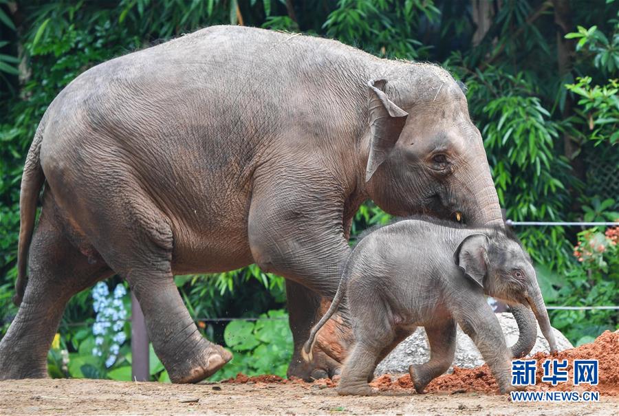 5月27日,廣州長(zhǎng)隆的新生亞洲象寶寶在媽媽的陪伴下玩耍。新華社記者劉大偉攝