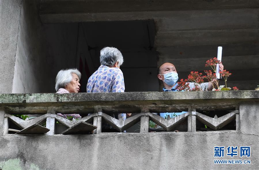 5月27日,福建省閩北地質(zhì)大隊離退休管理科黨員干部孔祥明(右一)向邵武市通泰街道老舊小區(qū)居民宣傳危房拆遷改造事宜。新華社記者林善傳攝
