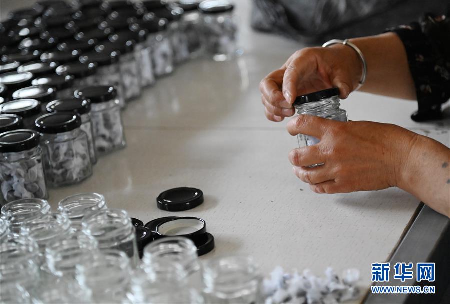 在平頂山市葉縣常村鎮(zhèn)月臺村扶貧車間,村民在趕制用艾草做成的臍貼(5月27日攝)。新華社記者張浩然攝