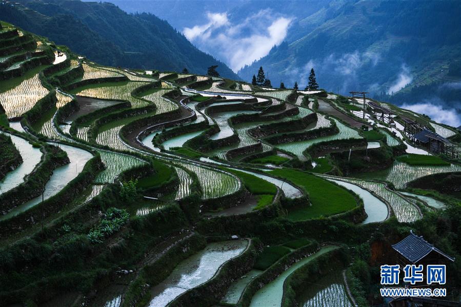 晨光中的從江縣加榜鄉(xiāng)加車梯田(5月28日攝)。夏日時(shí)節(jié),位于貴州省黔東南苗族侗族自治州從江縣加榜鄉(xiāng)加車、加頁(yè)、黨扭等苗寨的梯田在晨霧與陽(yáng)光的映襯下線條分明,光影變幻,景色如畫。新華社記者 楊文斌 攝