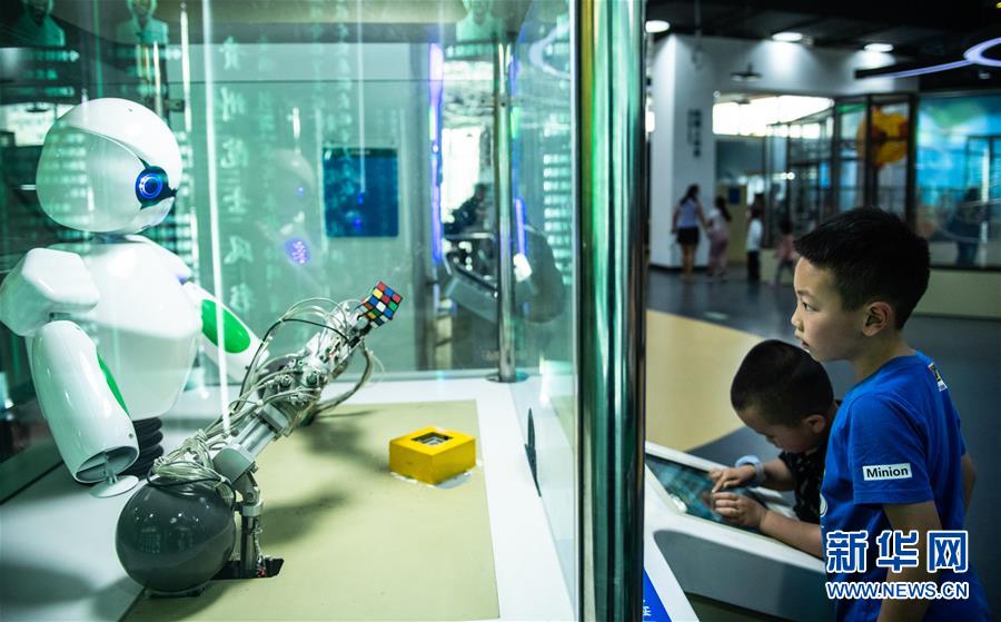 6月1日,小朋友在貴州科技館內操作機器人旋轉魔方。新華社記者陶亮攝。