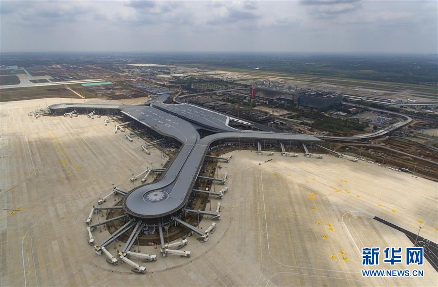 這是4月11日拍攝的建設中的??诿捞m國際機場二期項目航站樓(無人機照片)。新華社記者郭程攝