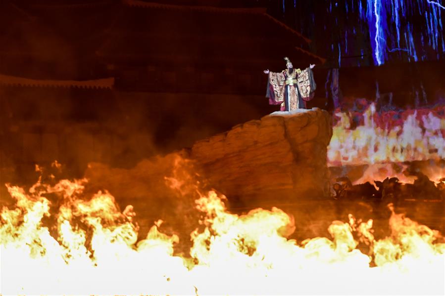 5月28日,演員在大型實(shí)景神話音樂劇《昆侖之約》中表演。5月28日,新疆文化旅游新名片——大型實(shí)景神話音樂劇《昆侖之約》在烏魯木齊南山景區(qū)上演。該劇融自然山水之美、藝術(shù)文化之光、現(xiàn)代科技之新于一體,為市民獻(xiàn)上一場視聽盛宴。新華社記者丁磊攝。