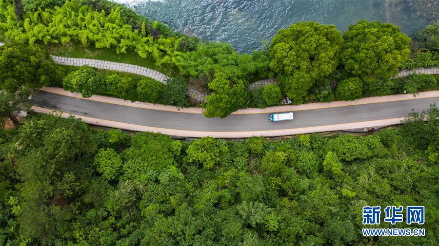 6月2日,車輛在阿哈湖國家濕地公園內行駛(無人機照片)。初夏時節(jié),貴州省貴陽市阿哈湖國家濕地公園草木蒼翠,風景如畫,吸引人們前來休閑游玩。新華社記者陶亮攝。