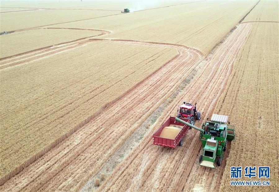 6月2日,在河南省黃泛區(qū)農(nóng)場九分場的麥田里,農(nóng)民操作大型收割機收獲小麥(無人機照片)。新華社記者李嘉南攝。