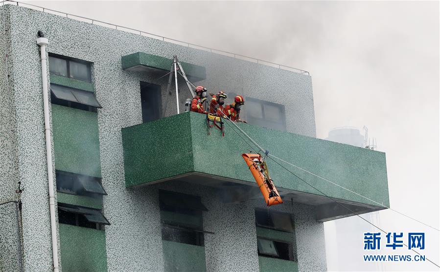 6月3日,救援人員在演練中使用索降營(yíng)救“被困”人員。新華社記者方喆攝。