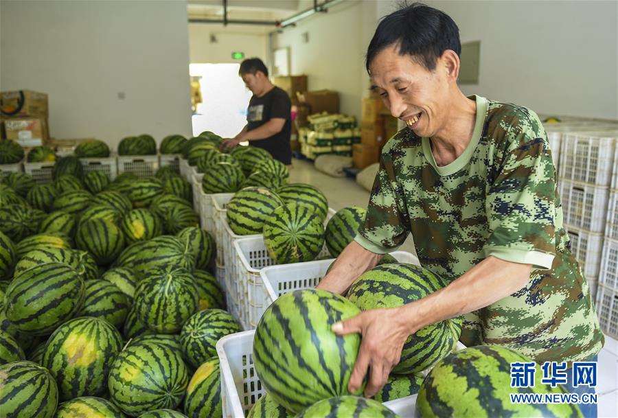 6月3日,村民在深州市鮮天下電商公司扶貧專區(qū)搬運西瓜。今年以來,河北省深州市圍繞決勝全面小康、決戰(zhàn)脫貧攻堅任務(wù)目標,在推進產(chǎn)業(yè)扶貧的過程中注重激發(fā)內(nèi)生動力,通過電商扶貧、扶貧車間、特色種植養(yǎng)殖等多種形式,提升自我“造血”功能,提高貧困群眾受益度。新華社記者李曉果攝。