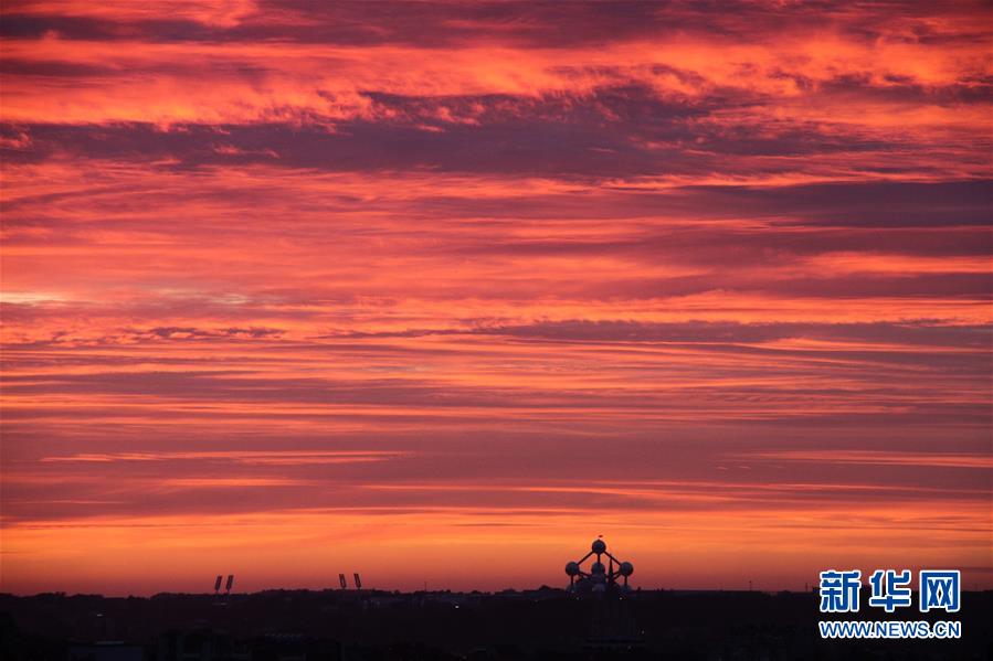 2020年5月22日黃昏時分,比利時首都布魯塞爾漫天的火燒云映襯著原子球塔。6月5日是第47個聯(lián)合國世界環(huán)境日,今年的主題為“關(guān)愛自然刻不容緩”。新華社記者鄭煥松攝。