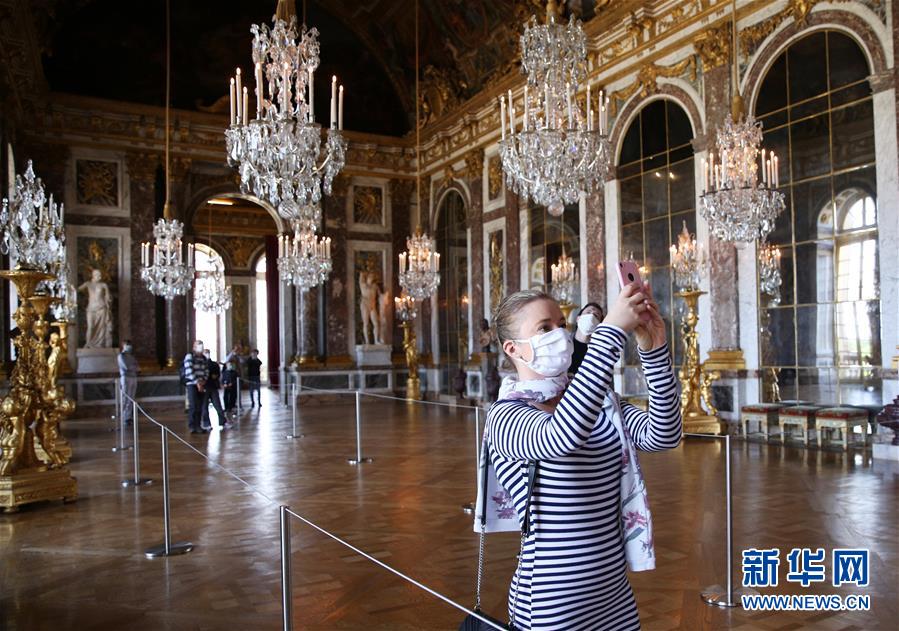 6月6日,一名游客戴著口罩在法國巴黎近郊凡爾賽宮的鏡廳內參觀游覽。 新華社記者 高靜 攝