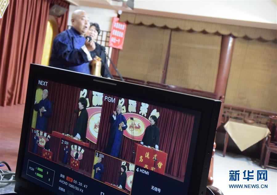 6月6日晚,天津名流茶館的相聲演員在付費(fèi)直播《名流名家“逗你玩”》演出中說相聲。隨著疫情防控形勢逐漸向好,天津的一些茶館紛紛轉(zhuǎn)戰(zhàn)“云端”說相聲,推出付費(fèi)直播演出,并邀請一些幸運(yùn)觀眾到現(xiàn)場觀看,在傳播津味相聲、培養(yǎng)年輕觀眾的同時(shí),也為即將到來的線下演出“預(yù)熱”。新華社記者周潤健攝
