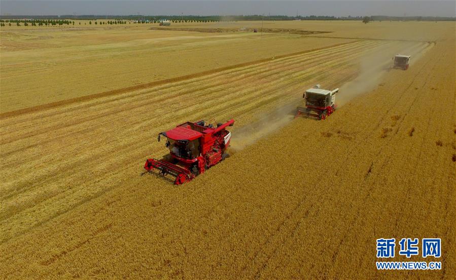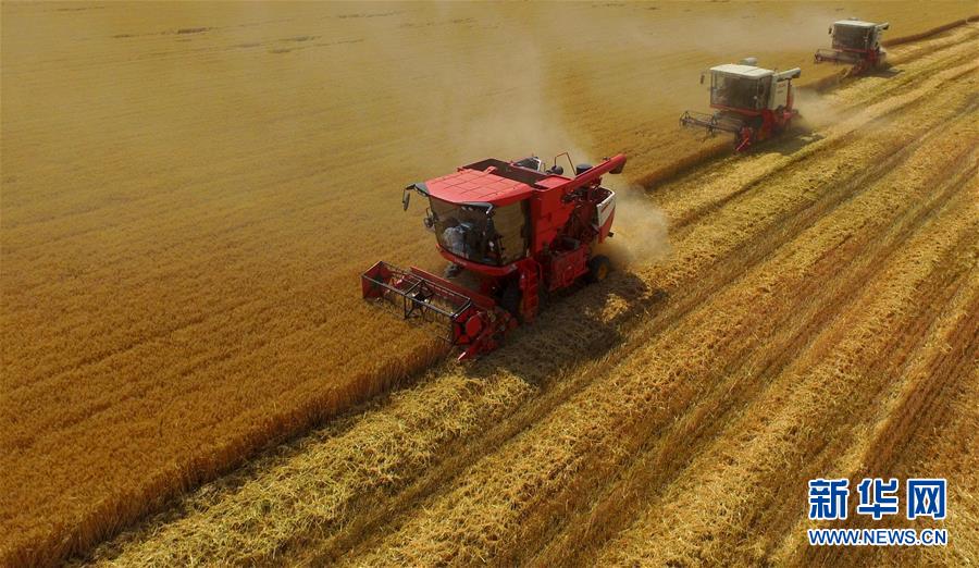 6月8日,聯(lián)合收割機在河北省南和縣閆里鄉(xiāng)閆里村麥田進行夏收作業(yè)(無人機照片)。“三夏”期間,河北省預(yù)計組織和調(diào)度小麥聯(lián)合收割機、拖拉機、夏玉米播種機等200萬臺農(nóng)業(yè)機械投入作業(yè)。新華社記者朱旭東攝