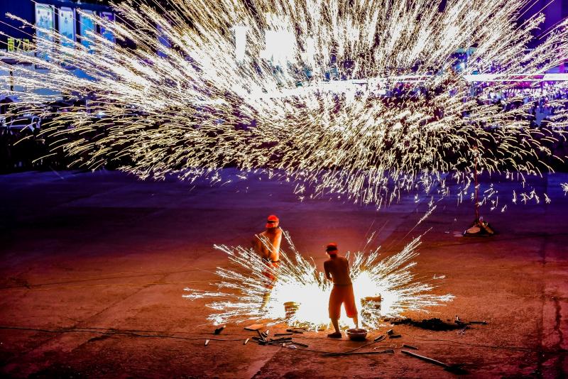 2020年6月7日晚8時許,吉林長春青岡立交橋附近,打鐵花時,先把熔好的鐵汁注入事先準備好的“花棒”。一個拳頭粗細、一尺多長的柳樹棒,棒的頂端掏有直徑3厘米的圓形坑槽,用以盛放鐵汁。打鐵花者一手拿著盛有鐵汁的“花棒”,用下棒猛擊盛有鐵汁的上棒,使棒中鐵汁沖向花棚,鐵汁遇到棚頂?shù)牧Χ派⒊鼍薮蟮幕鸹āN宀世_紛、震天動地。