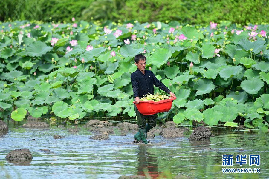6月9日,村民在??邶埲A區(qū)龍泉鎮(zhèn)美仁坡村采摘蓮蓬。初夏時節(jié),位于海南??邶埲A區(qū)龍泉鎮(zhèn)的蓮蓬逐漸成熟,當(dāng)?shù)卮迕窦泳o采摘,一派繁忙景象。新華社記者蒲曉旭攝