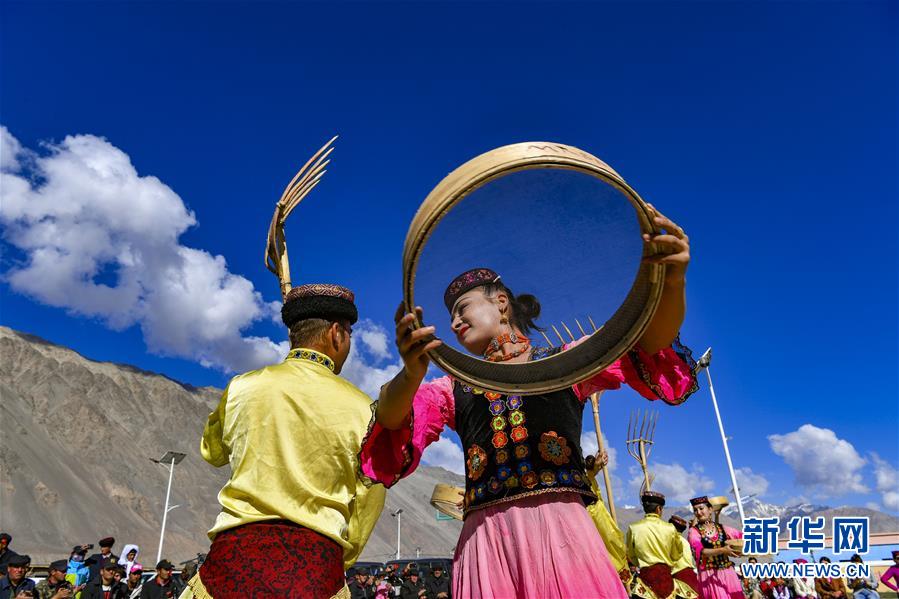 在熱斯喀木村,新疆塔什庫爾干塔吉克自治縣文工團(tuán)演員為村民表演國家級(jí)非物質(zhì)文化遺產(chǎn)——塔吉克族鷹舞(6月6日攝)。新華社記者胡虎虎攝