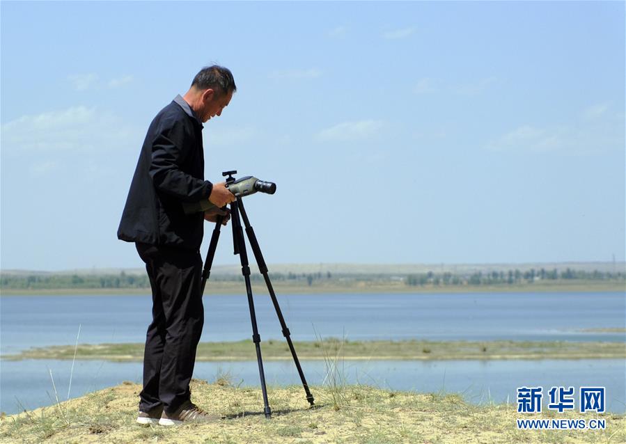 6月9日,鄂爾多斯遺鷗國家級自然保護(hù)區(qū)東勝管理站站長任永奇,用望遠(yuǎn)鏡觀察泊江海子鳥類生活情況。近年來,在當(dāng)?shù)卣亩喾N措施治理下,曾經(jīng)水面萎縮的內(nèi)蒙古自治區(qū)鄂爾多斯市境內(nèi)的泊江海子水量逐漸恢復(fù)。近期,包括遺鷗在內(nèi)的40多種鳥類來此棲息,泊江海子重新成為鳥類的樂園。新華社記者賈立君攝