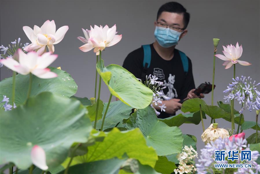 6月12日,游人在西湖郭莊觀看荷展。隨著氣溫升高,杭州西湖荷花次第開(kāi)放,引得游人駐足。新華社記者 翁忻旸 攝