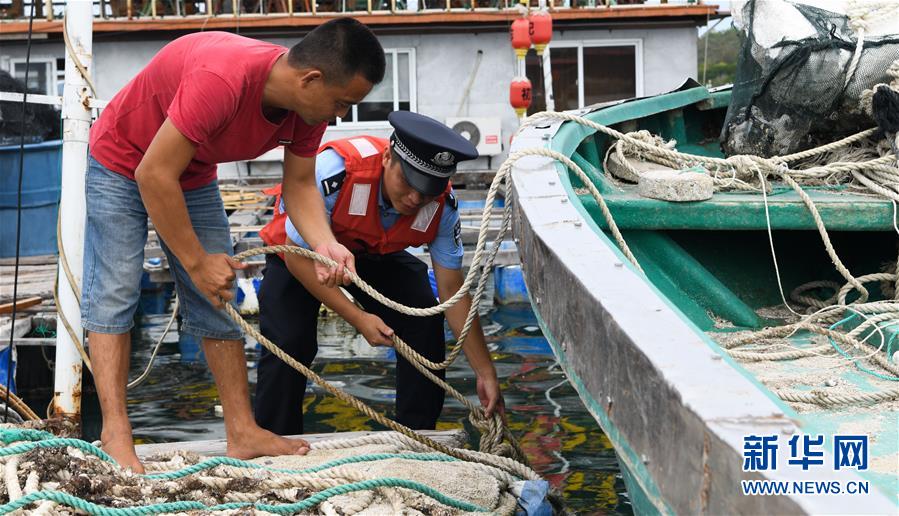 6月13日,海南省公安廳海岸警察總隊(duì)(籌備組)陵水支隊(duì)民警幫助轄區(qū)內(nèi)漁民固定漁船。當(dāng)日,海南省氣象局于16時(shí)30分繼續(xù)發(fā)布臺(tái)風(fēng)四級(jí)預(yù)警。今年第2號(hào)臺(tái)風(fēng)“鸚鵡”(熱帶風(fēng)暴級(jí))預(yù)計(jì)于14日在廣東沿海登陸。新華社記者楊冠宇攝。