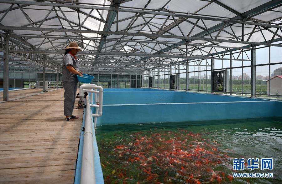 在天津現(xiàn)代晨輝科技集團有限公司的養(yǎng)殖示范場,工人在投喂飼料(6月15日攝)。近年來,天津市寶坻區(qū)大白莊鎮(zhèn)大力發(fā)展觀賞魚養(yǎng)殖,在當(dāng)?shù)佚堫^企業(yè)的帶動下,成為增加農(nóng)民收入的新途徑。據(jù)了解,企業(yè)對附近養(yǎng)殖戶統(tǒng)一提供苗種、飼料、技術(shù)支持,以及觀賞魚成魚后保價回收的服務(wù)。養(yǎng)殖戶每畝水面平均收入約1.8萬元,解決周邊農(nóng)民就業(yè)近200人。新華社記者 李然 攝