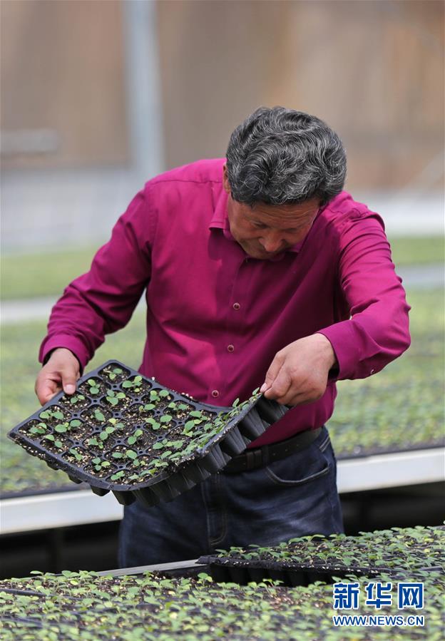 在遼寧省盤錦市大洼區(qū)新興鎮(zhèn)坨子里村,劉廣會在自己經(jīng)營的育苗企業(yè)內(nèi)查看蔬菜種苗生長情況(6月9日攝)。新華社記者 楊青 攝