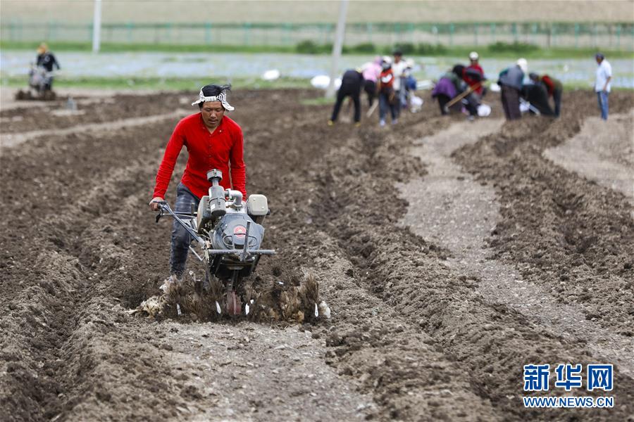 在四川省阿壩藏族羌族自治州壤塘縣尕多鄉(xiāng)瑟谷村熱不卡小組,村民尚壤扶著微耕機(jī)在蔬菜基地里耕地(6月13日攝)。新華社記者 沈伯韓 攝