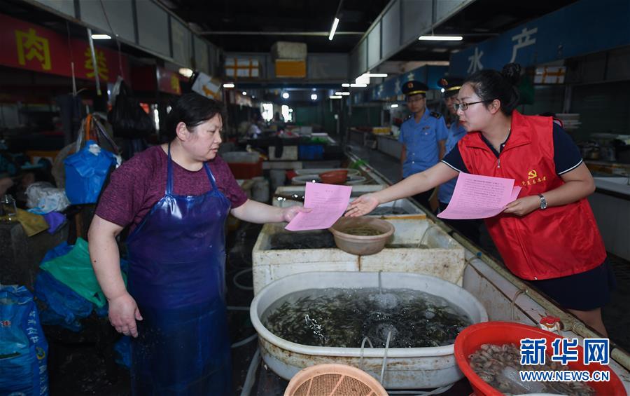 6月17日,黨員志愿者(右一)在東林鎮(zhèn)農(nóng)貿(mào)市場給經(jīng)營戶發(fā)放野生動物保護及禁食倡議書。新華社記者 徐昱 攝